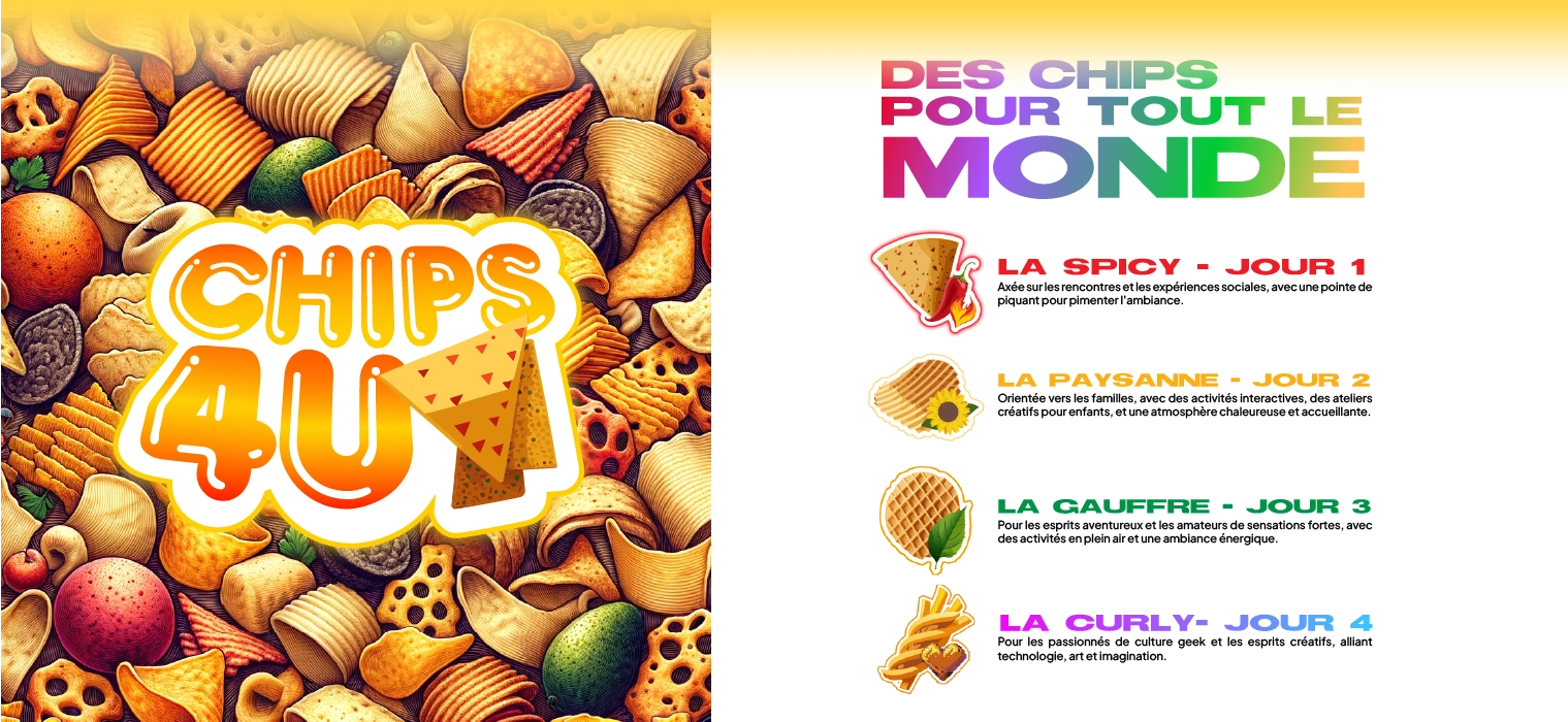 CHIPSFORU est un festival inédit, s'étalant sur 4 jours avec un concept unique qui célèbre l'univers des chips sous toutes ses formes. Chaque journée est conçue pour cibler un public spécifique, offrant des expériences immersives, des animations fun, et des ambiances musicales adaptées. Le festival fusionne la culture populaire des chips avec des activités ludiques, des concerts dynamiques, et des expériences gustatives inoubliables, créant ainsi une plateforme de rencontres et de partage intergénérationnel.